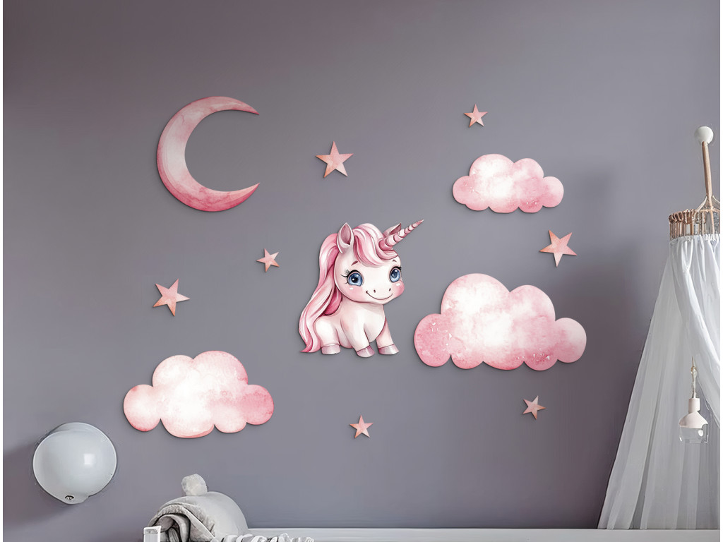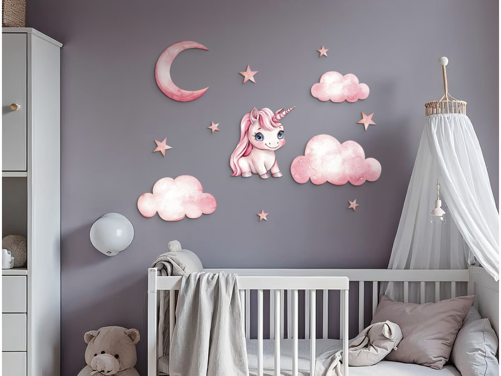 Un fiabesco unicorno rosa fluttua tra le nuvole, mentre sopra di lui brillano la luna e le scintillanti stelle. L'illustrazione ha un effetto delicato, rilassante e magico, ideale per la cameretta dei piccoli sognatori che credono nei miracoli.