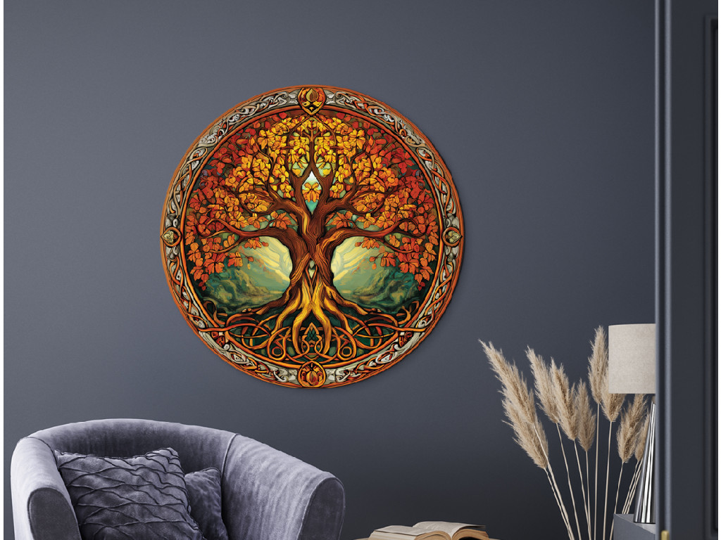 Albero della vita – Autunno unisce il simbolismo del ciclo eterno ai caldi colori dell'autunno. La chioma dell'albero nei toni dell'arancione, del giallo e del rosso contrasta con lo sfondo verde e la cornice dettagliata con ornamenti celtici. La ricca struttura delIl quadro gli conferisce un carattere mistico e artistico che ravviva ogni interno.