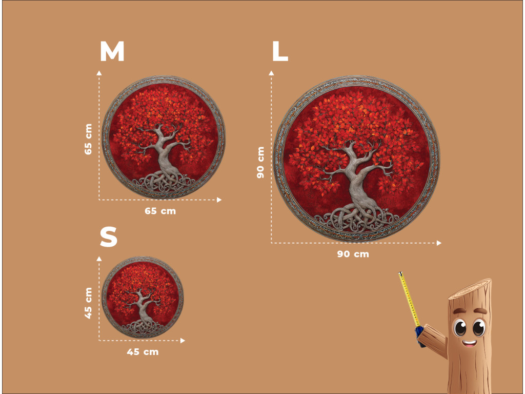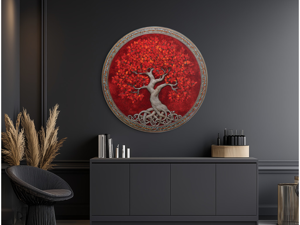L'albero della vita rotondo Il mondo celtico raffigura un imponente albero con rami e radici intrecciati in stile celtico. Le foglie rosso intenso contrastano con il tronco grigio chiaro e lo sfondo rosso scuro, mentre la cornice ornamentale sottolinea il carattere mistico ed elegante dell'opera.