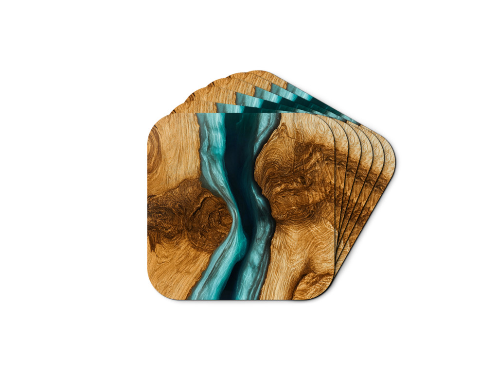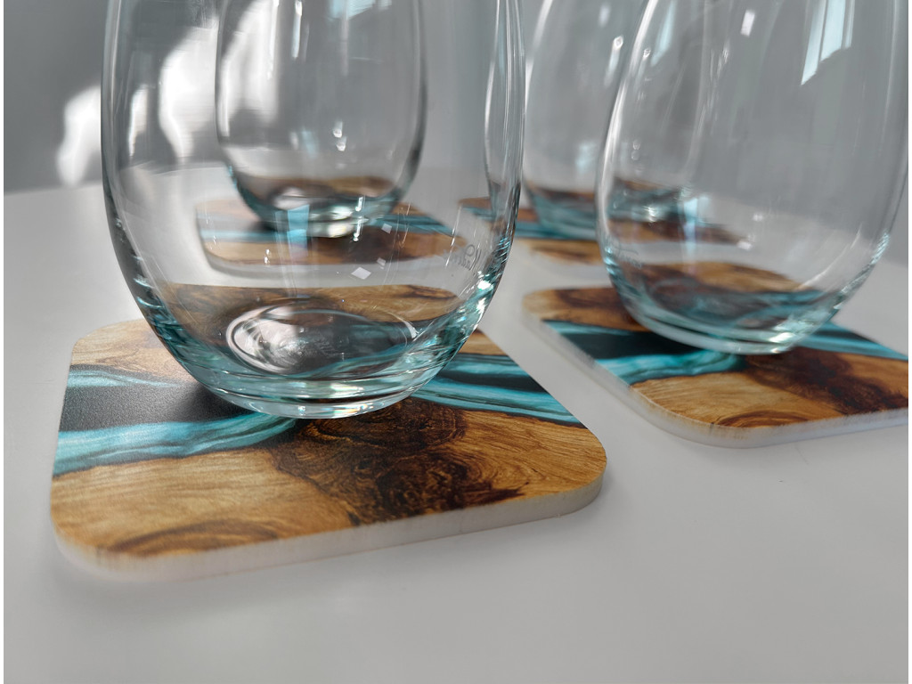 Ogni sottobicchiere ha una dimensione di 10 × 10 cm, uno spessore di 5 mm e angoli arrotondati che conferiscono un aspetto elegante e sono piacevoli al tatto. Il loro motivo in legno-epossidico conferisce all'ambiente un carattere moderno e fresco, che si adatta perfettamente sia agli interni minimalisti che a quelli giocosi.