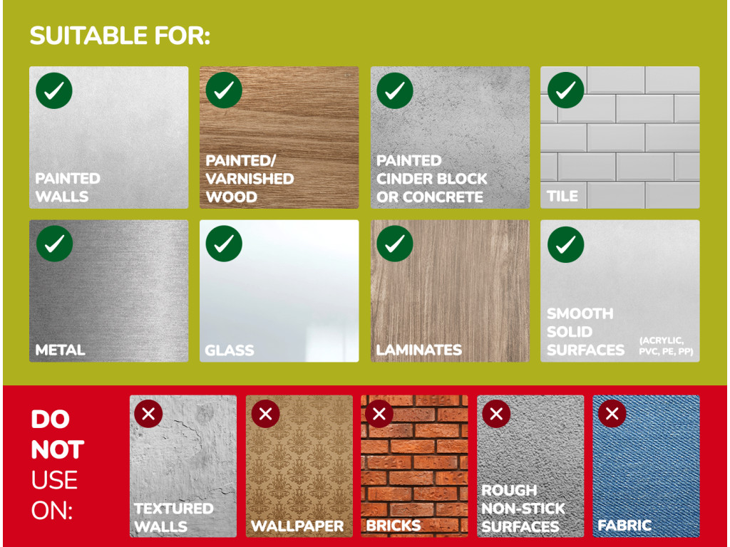 - Aderisce alle superfici lisce come pareti verniciate, piastrelle, vetro, legno, metallo.