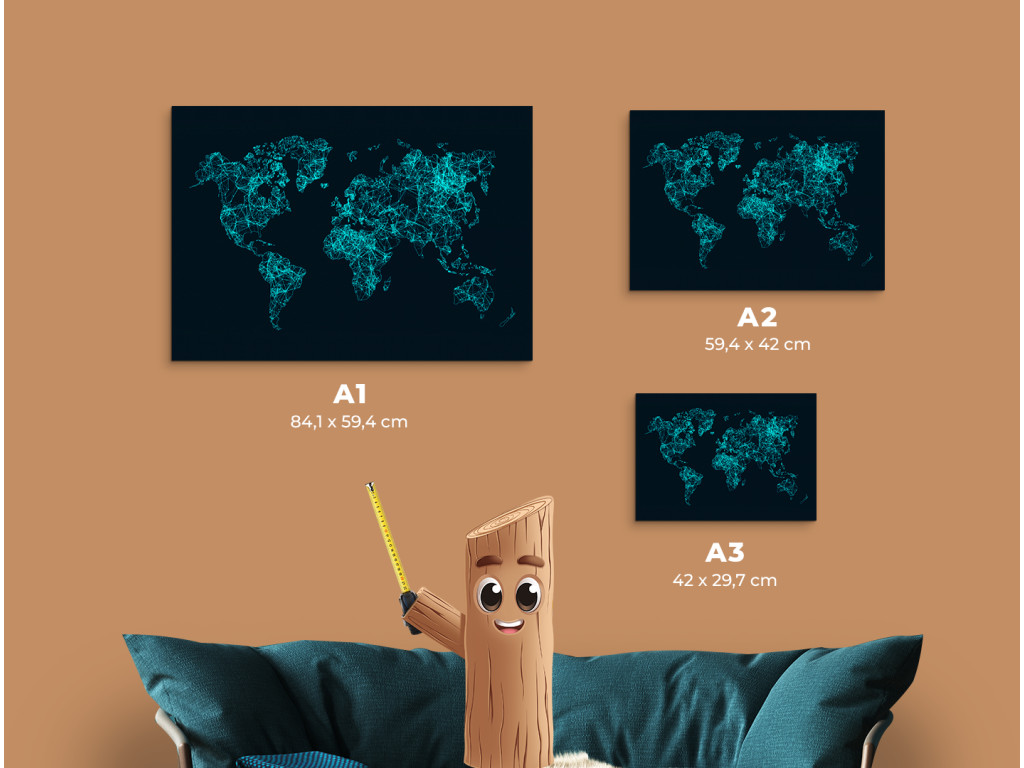 La mappa del mondo in stile rete raffigura la connettività globale attraverso punti e linee interconnessi. Il colore turchese su sfondo scuro conferisce all'immagine un carattere moderno e tecnologico. Grazie alla stampa UV, l'immagine appare pulita e nitida ed è adatta per uffici, studi o interni moderni incentrati sulla tecnologia e l'innovazione.