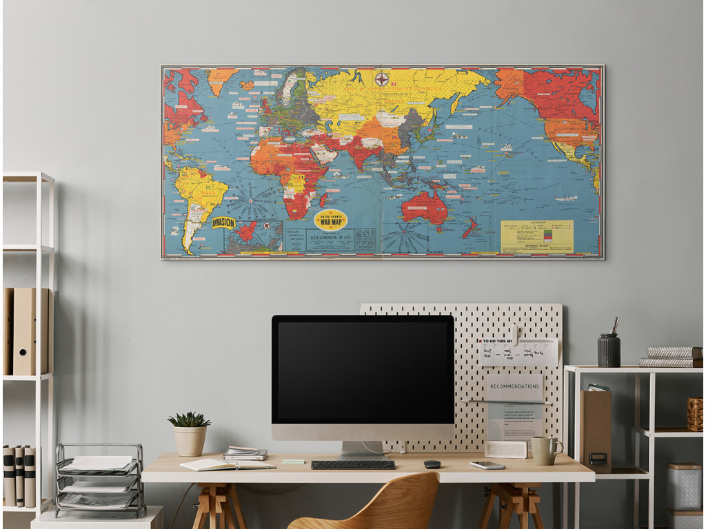 L'originale mappa di guerra del 1944 di Stanley Turner cattura gli eventi chiave della seconda guerra mondiale utilizzando una codifica a colori dei territori e delle operazioni militari. La mappa, nota come Dated Events War Map, è un importante documento storico legato al periodo del D-Day. Come decorazione ha un effetto autentico ed educativo ed è adatta a uno studio, un ufficio o un interno con un interesse per la storia.