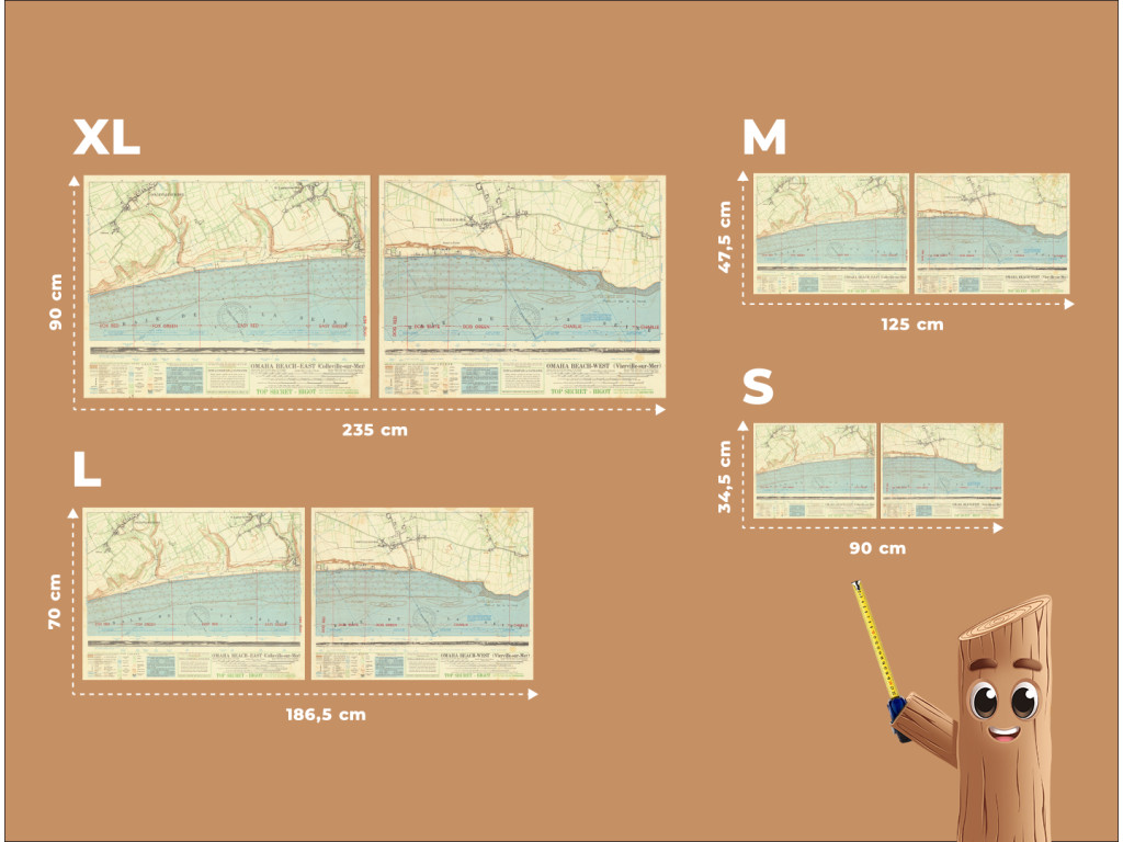 Le mappe storiche del 1944 mostrano i preparativi dettagliati dello sbarco a Omaha Beach durante il D-Day. Contrassegnate come TOP SECRET – BIGOT, mostrano le linee difensive tedesche e gli ostacoli lungo la costa di Colleville-sur-Mer e Vierville-sur-Mer. L'immagine ha un forte valore storico ed è adatta a uno studio, un ufficio o uno spazio dedicato alla storia militare.