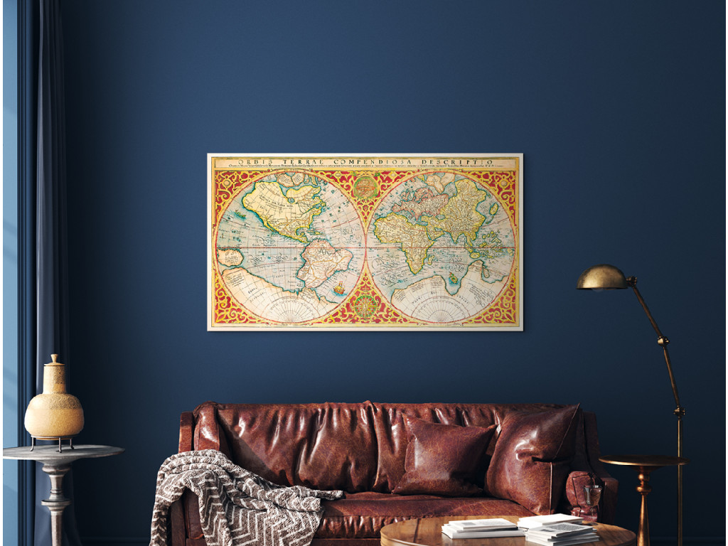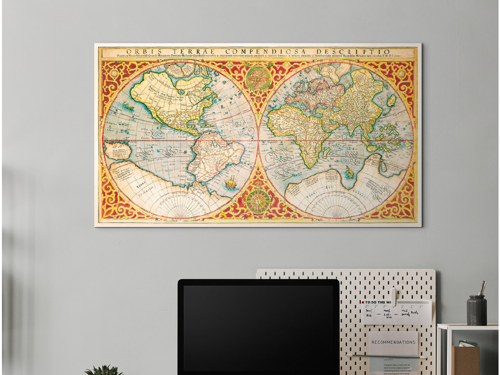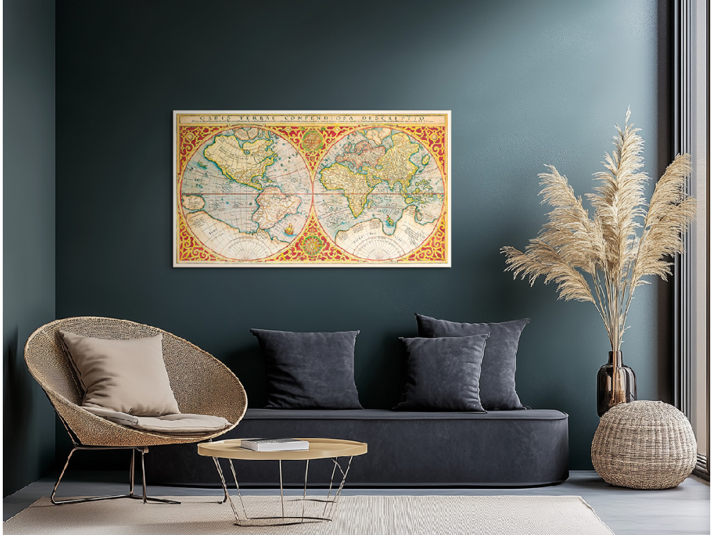 La mappa storica del mondo del 1587 di Gerhard Mercator è una delle prime opere che utilizzano la famosa proiezione di Mercator. La mappa rappresenta una svolta nella cartografia e ha influenzato in modo significativo il modo di rappresentare il mondo. Ha un effetto educativo e decorativo ed è ideale per uno studio, una biblioteca o un interno con un interesse per la storia e la scoperta.