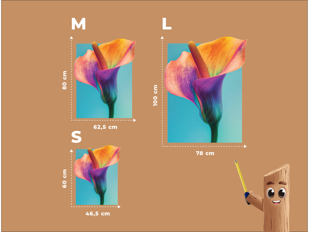 La rappresentazione artistica di calas nei toni dell'arancione e del viola su uno sfondo blu intenso crea un forte contrasto visivo pieno di eleganza e armonia. I colori intensi del fiore appaiono vivaci e allo stesso tempo delicati, sottolineando le linee armoniose della forma tubolare della calla. L'opera combina toni caldi e freddi in un insieme equilibrato, che appare moderno, ma allo stesso tempo tranquillo e sensuale.
