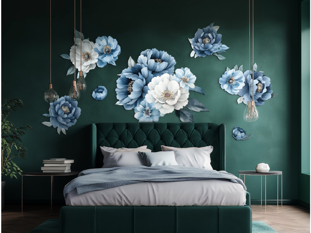 I fiori dipinti liberamente nei toni del bianco e del blu, che ricordano le peonie o le rose, creano una composizione delicata e ariosa, piena di eleganza. Lo stile espressivo con sfumature acquerellate enfatizza le forme dei fiori e delle foglie senza dettagli superflui, conferendo all'opera un aspetto fresco e moderno.
