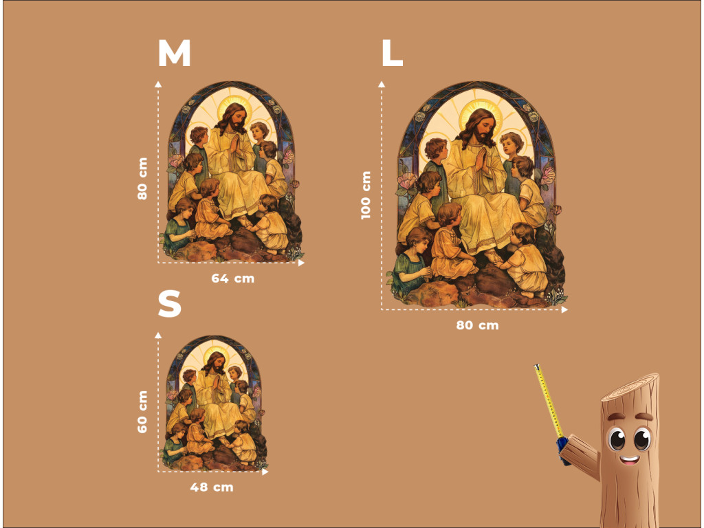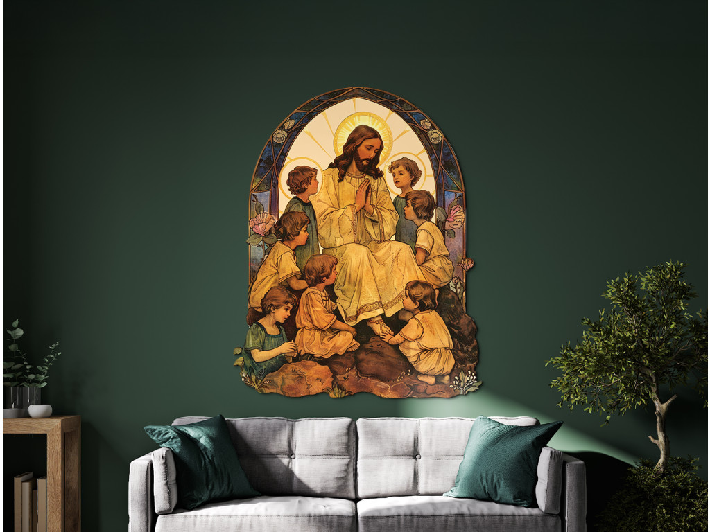 Il quadro raffigura Gesù Cristo seduto in mezzo a un gruppo di bambini, in uno stile che ricorda una vetrata o un dipinto su vetro. Gesù, con l'aureola, ha le mani giunte in preghiera o in segno di benedizione, mentre i bambini seduti intorno a lui guardano il suo volto con rispetto e fiducia. Lo sfondo ad arco con dettagli colorati esalta il carattere sacro e sereno della scena, che ricorda le parole bibliche: “Lasciate che i bambini vengano a me, non glielo impedite, perché a loro appartiene il regno di Dio”.