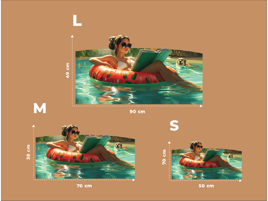 Il quadro ritrae una tranquilla scena estiva: una donna su un salvagente rosso a forma di anguria legge un libro, mentre un cane nuota nella piscina. L'atmosfera è rilassata, piena di calore solare e relax in riva al mare.