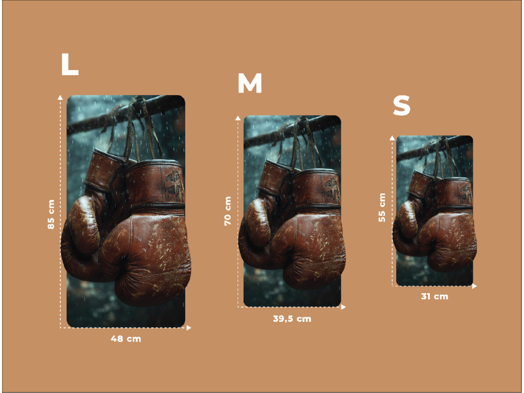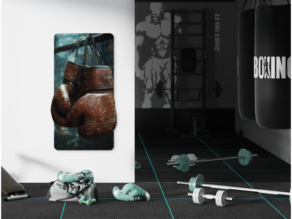 Guantoni da boxe marroni consumati appesi a un'asta, con gocce d'acqua sullo sfondo. Il quadro trasmette un forte senso di storia, perseveranza e lotta, come se i guantoni raccontassero la storia di molte battaglie.